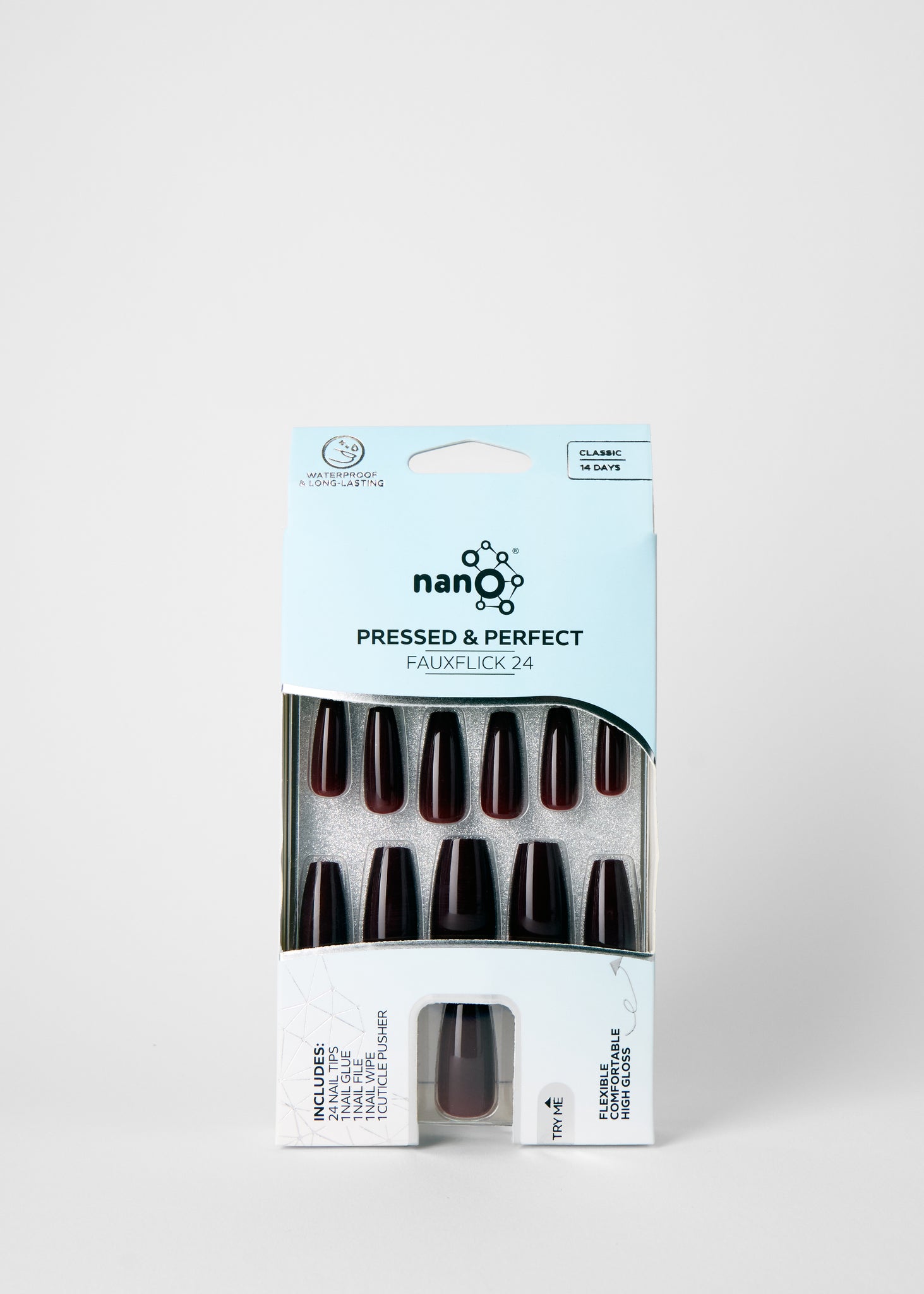 Nano® Crimson Noir Pressed on Nails - 24pcs with Glue | Instant Gel-Like Shine, Deep Burgundy Glossy Fake Nails Set