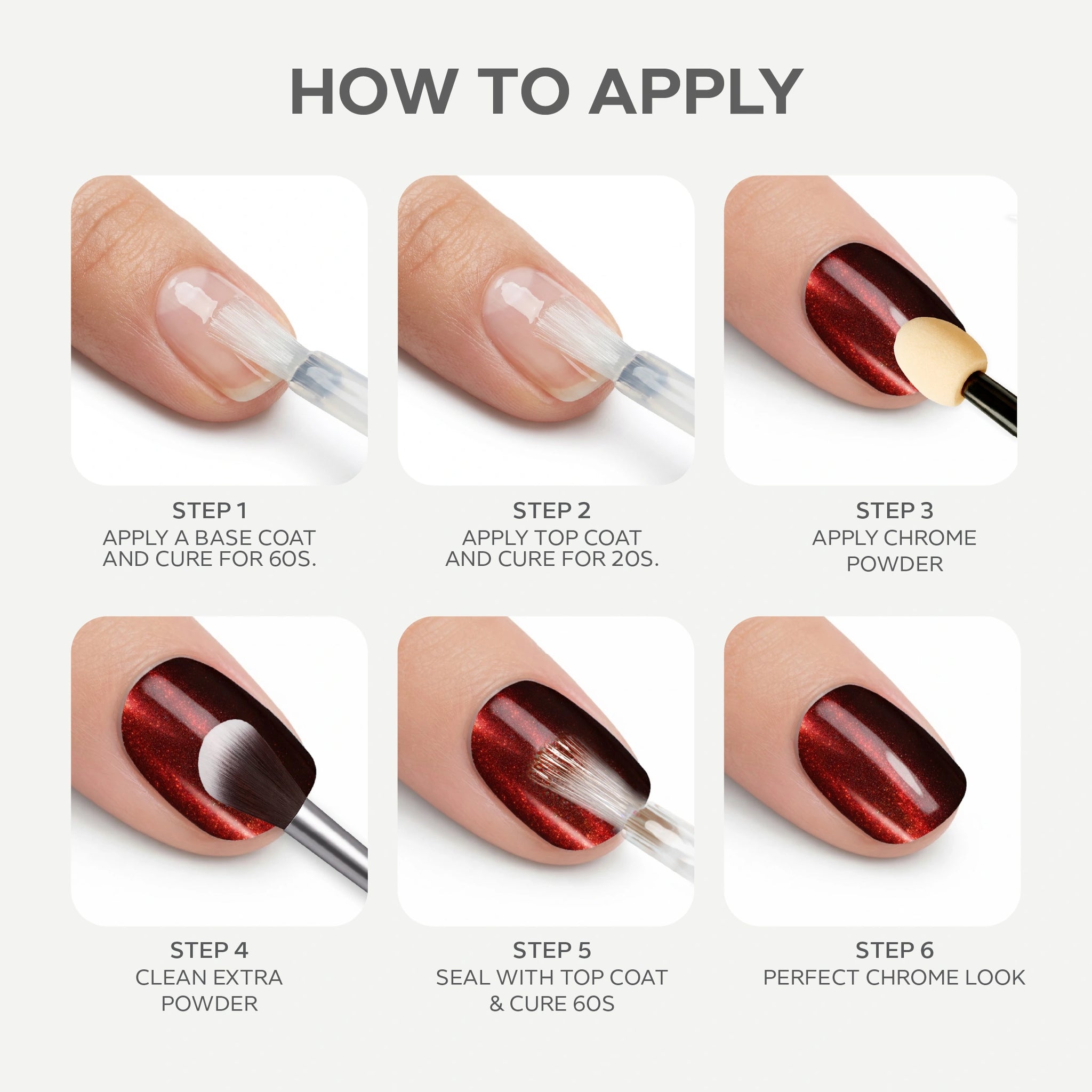 - Use gentle strokes when applying the chrome powder to prevent streaks.