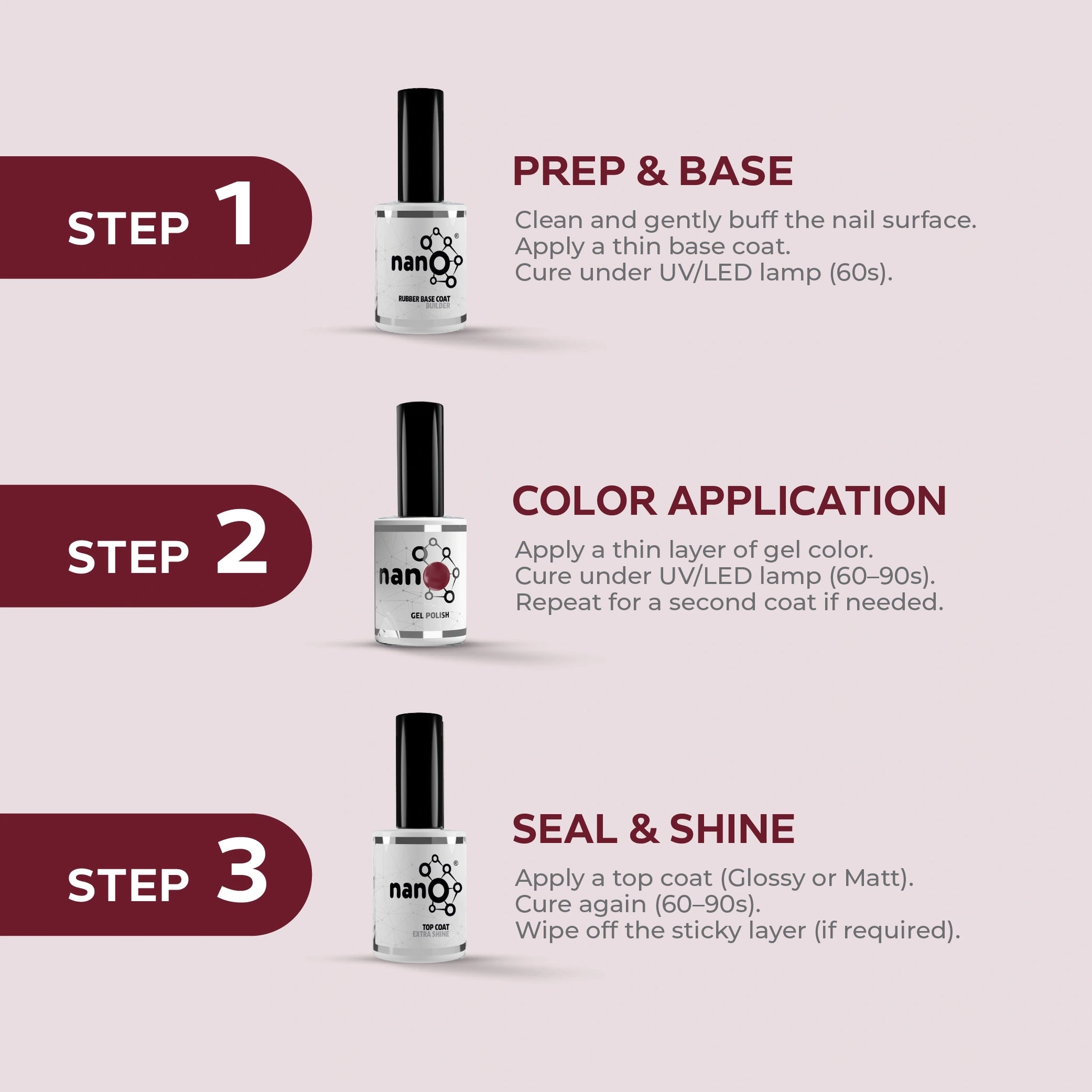 - Apply a second layer of Nano® gel nail polish and cure it under the Nano UV/LED lamp for an additional 60 seconds.