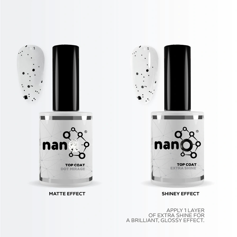 - Finish the procedure with the Nano® Extra Shine top coat to seal in the polish. and cure the same for 60 seconds.