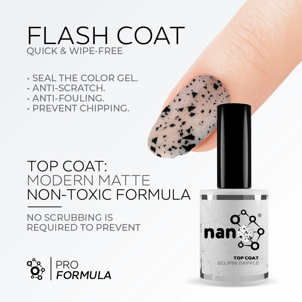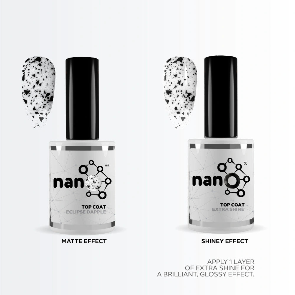 - Finish the procedure with the Nano® Extra Shine top coat to seal in the polish. and cure the same for 60 seconds.