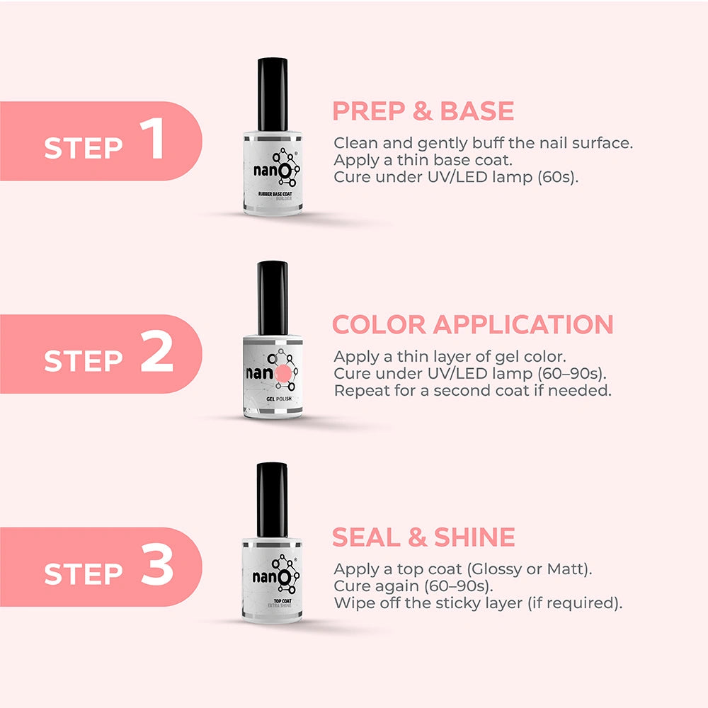 - Apply the first layer of Nano gel nail polish over the base coat and cure it for 60 seconds under a UV/LED lamp.