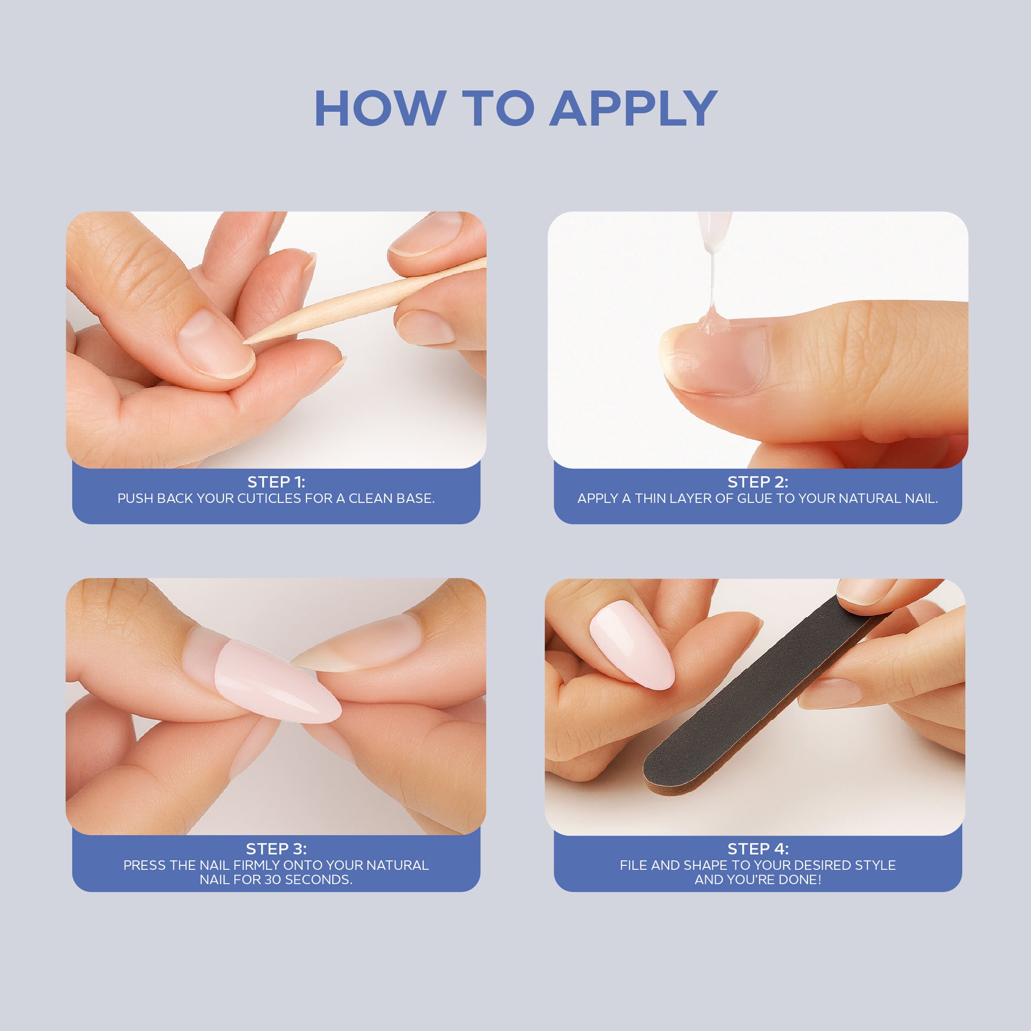 - Instant Application: Pre-shaped and ready-to-wear press-ons that adhere effortlessly using the included glue.