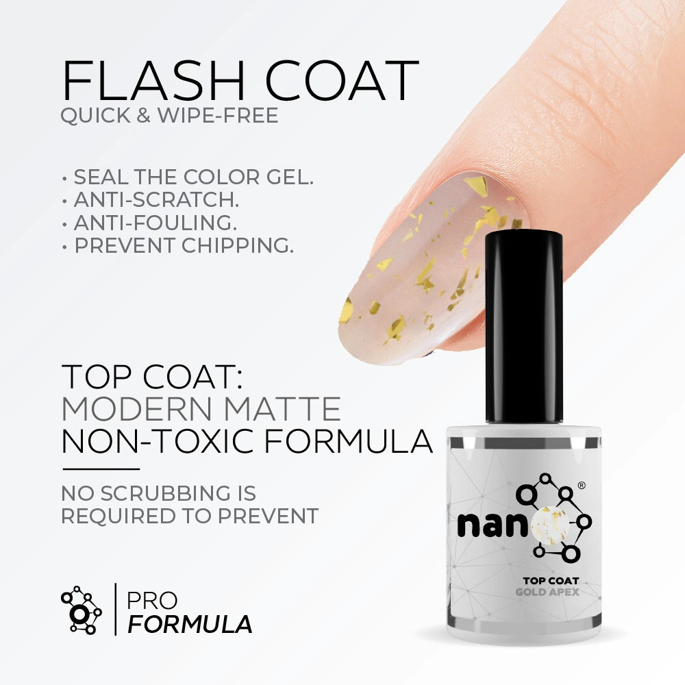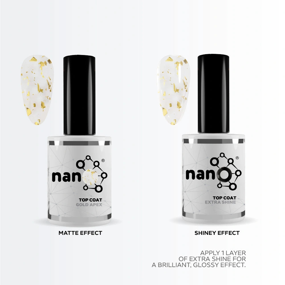 - Finish the procedure with the Nano® Extra Shine top coat to seal in the polish. and cure the same for 60 seconds.
