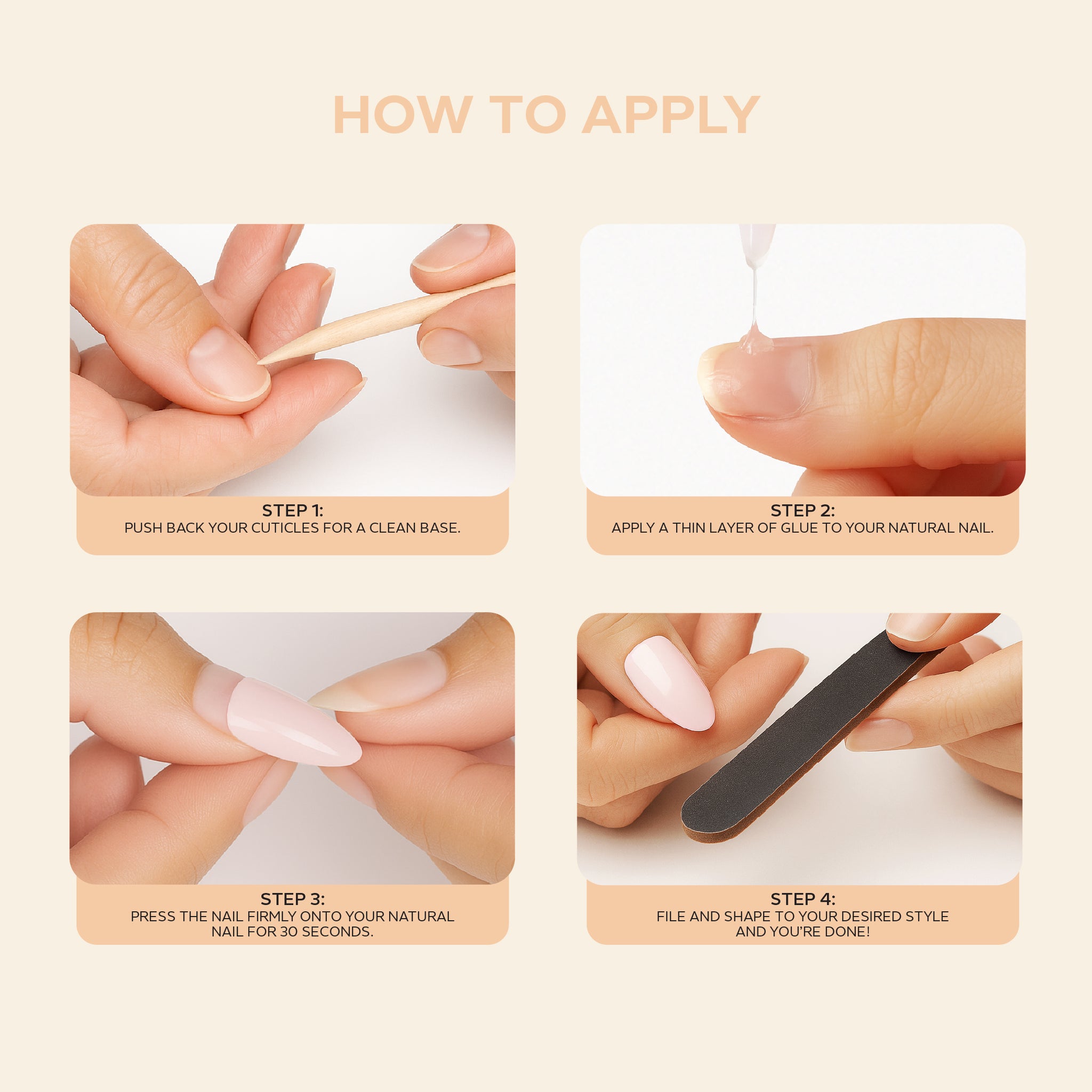 3. Quick & Easy Application: Pre-shaped press-ons that apply instantly with the included nail glue — no polish or UV lamp required.