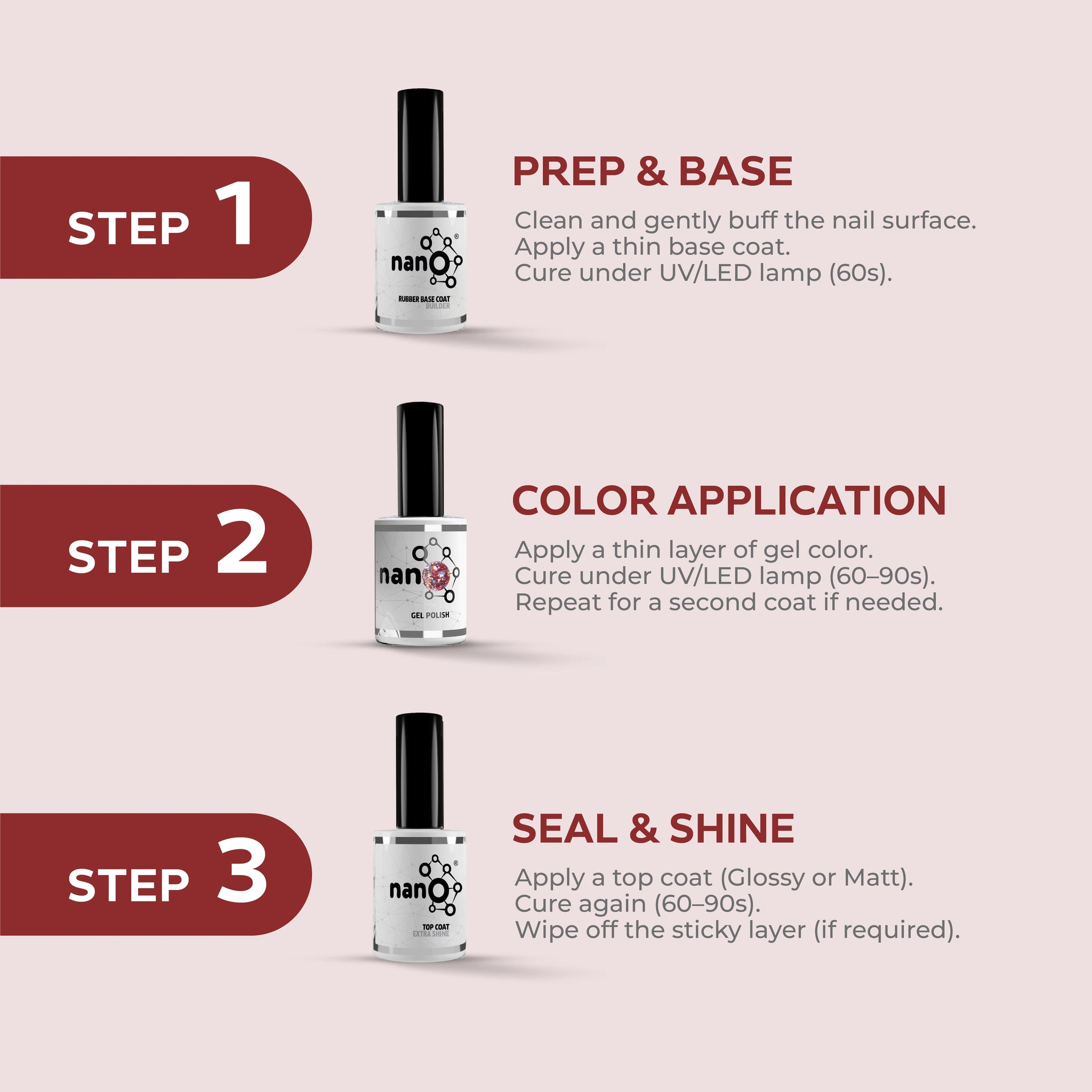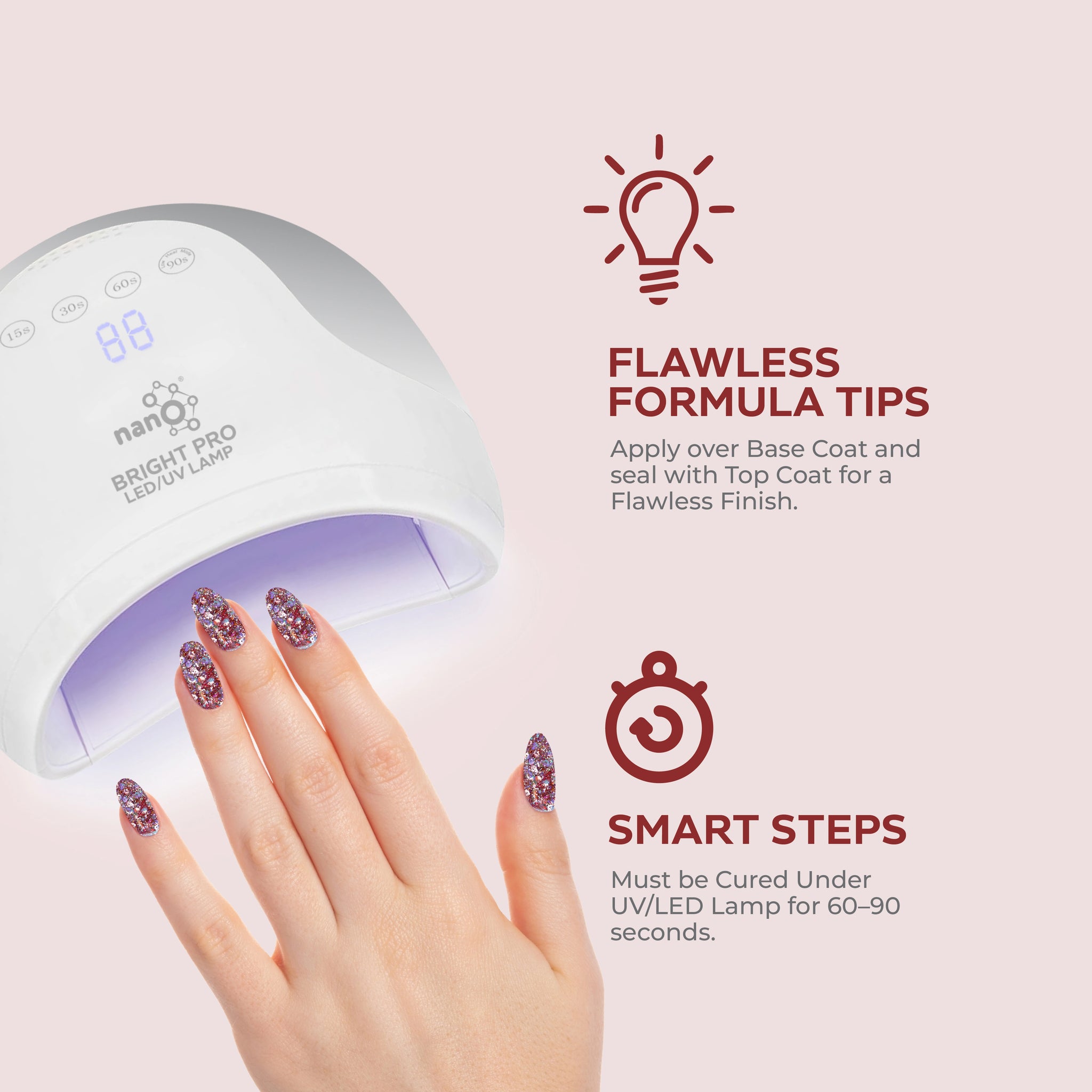 - Apply a second layer of Nano® gel nail polish and cure it under the Nano UV/LED lamp for an additional 60 seconds.