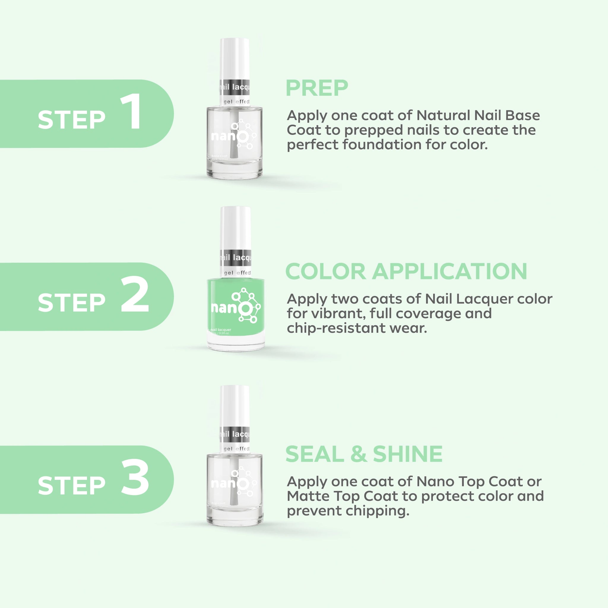 - Finish by applying Nano® Normal Top Coat for a long-lasting, high-gloss finish.