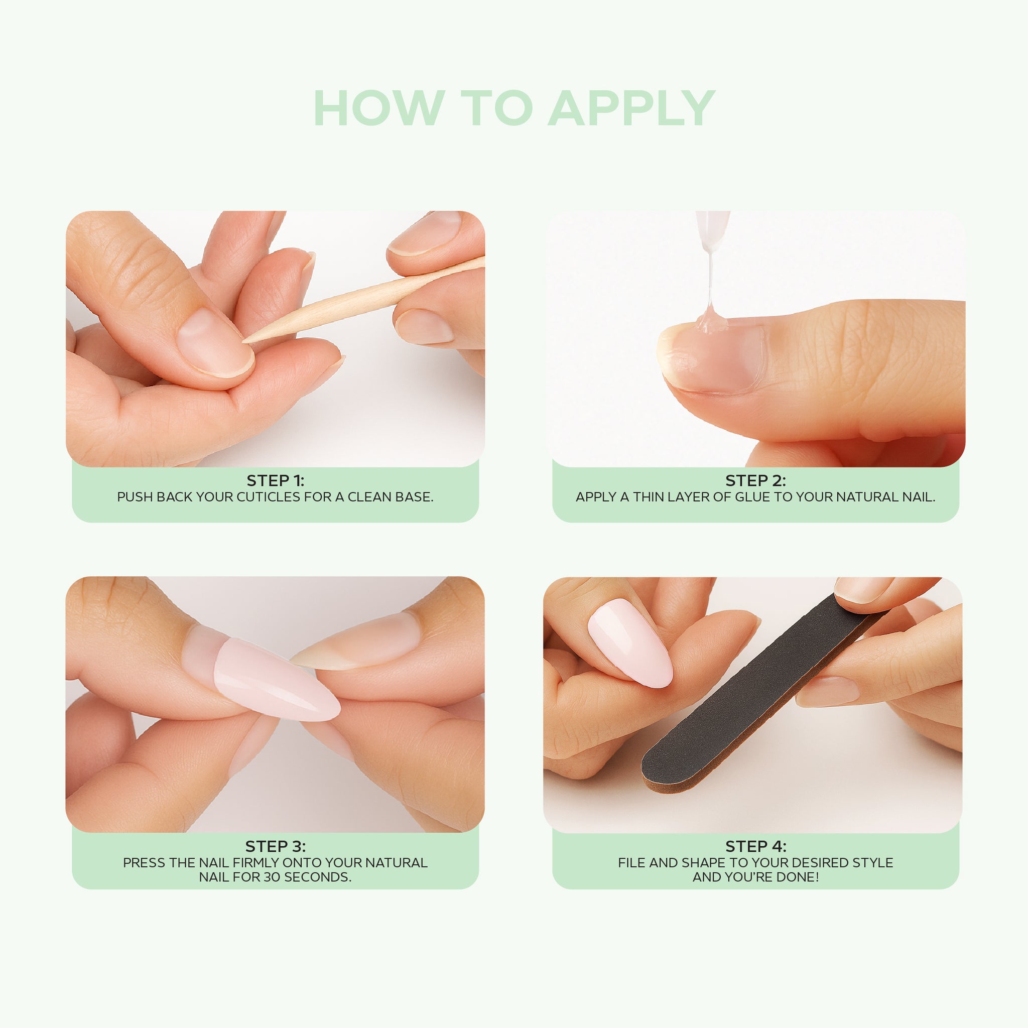 - 24 pre-shaped press-on nails with natural curve
