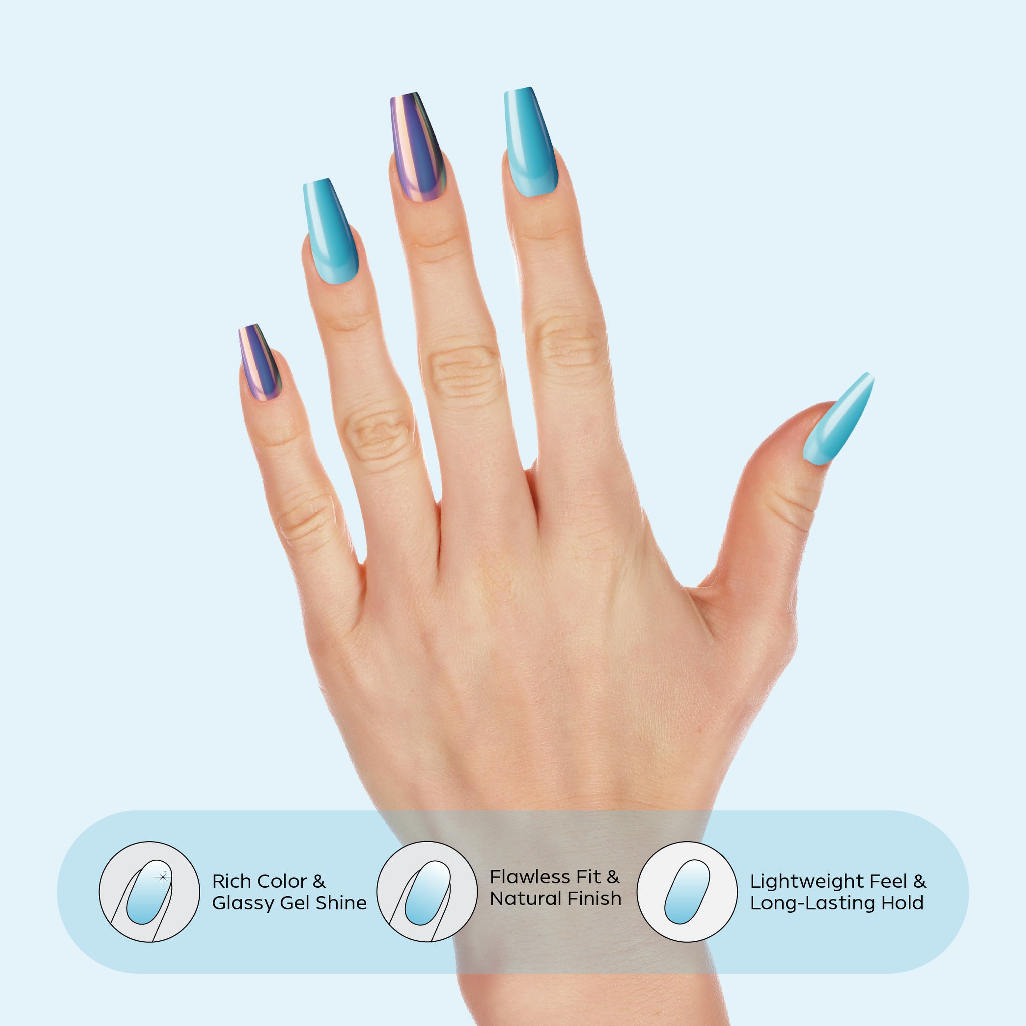 Nano® Mirror Chrome & Aqua Blue Pressed on Nails - 24pcs with Glue | Instant Gel-Like Shine, Dual-Tone Chrome Blue Fake Nails Set