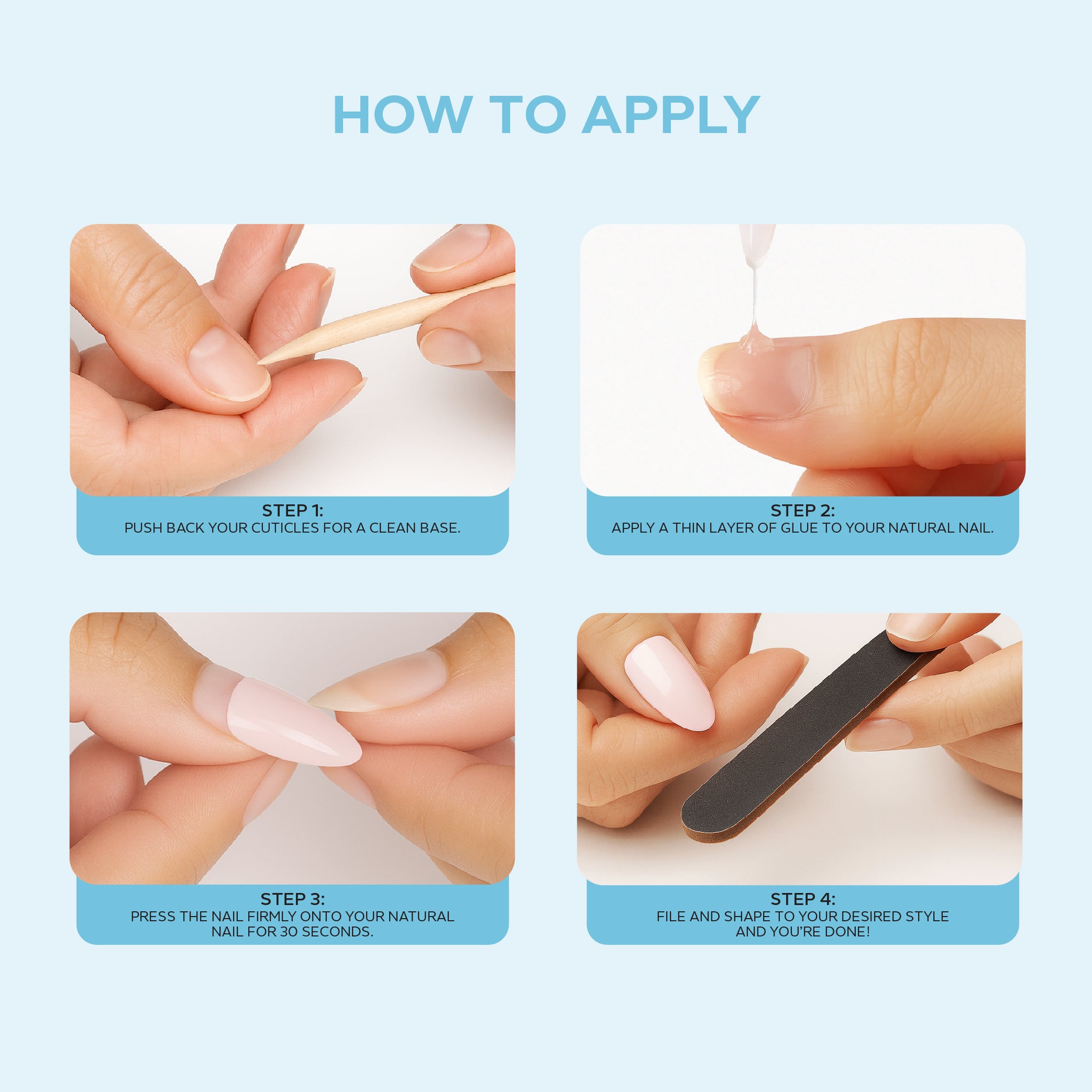3. Instant Application: Pre-shaped and ready to wear — simply apply with the included nail glue for a flawless finish in minutes.