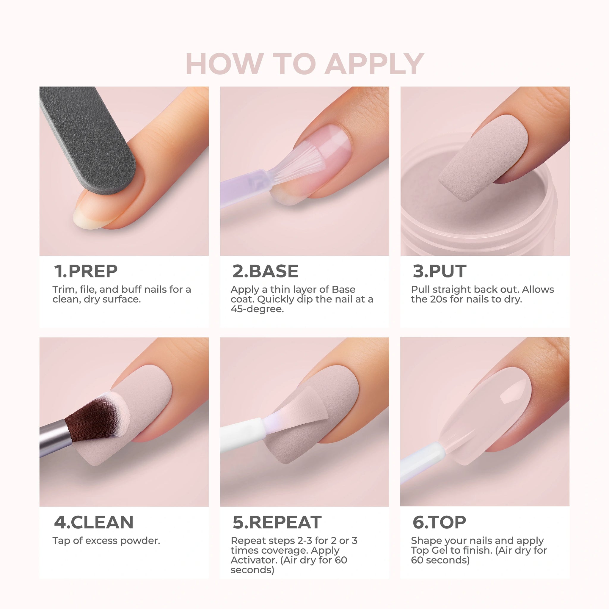 - Set with Activator: Once the dipping process is complete, apply Nano® Dip Powder Activator generously to each nail. This hardens the layers and locks them in place.