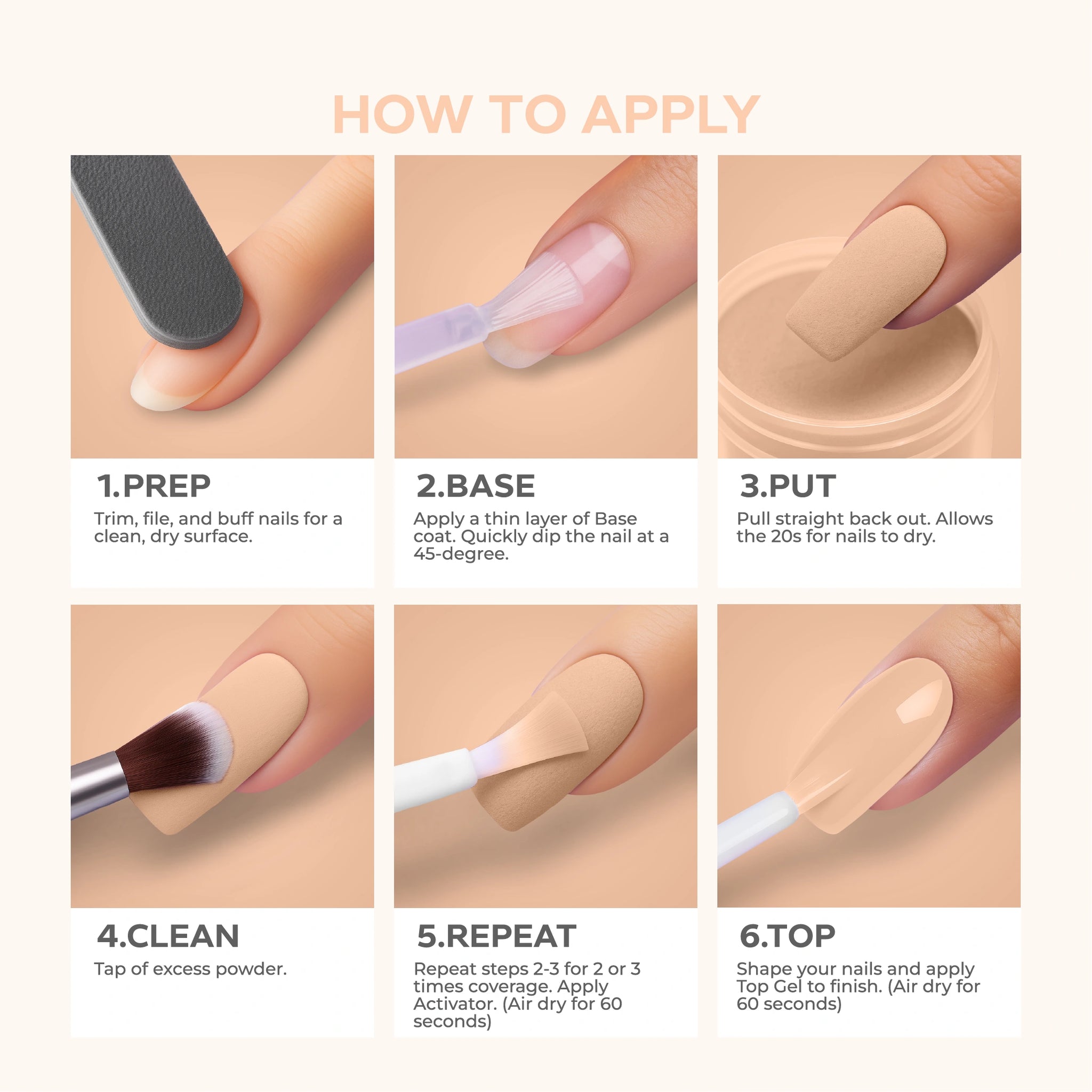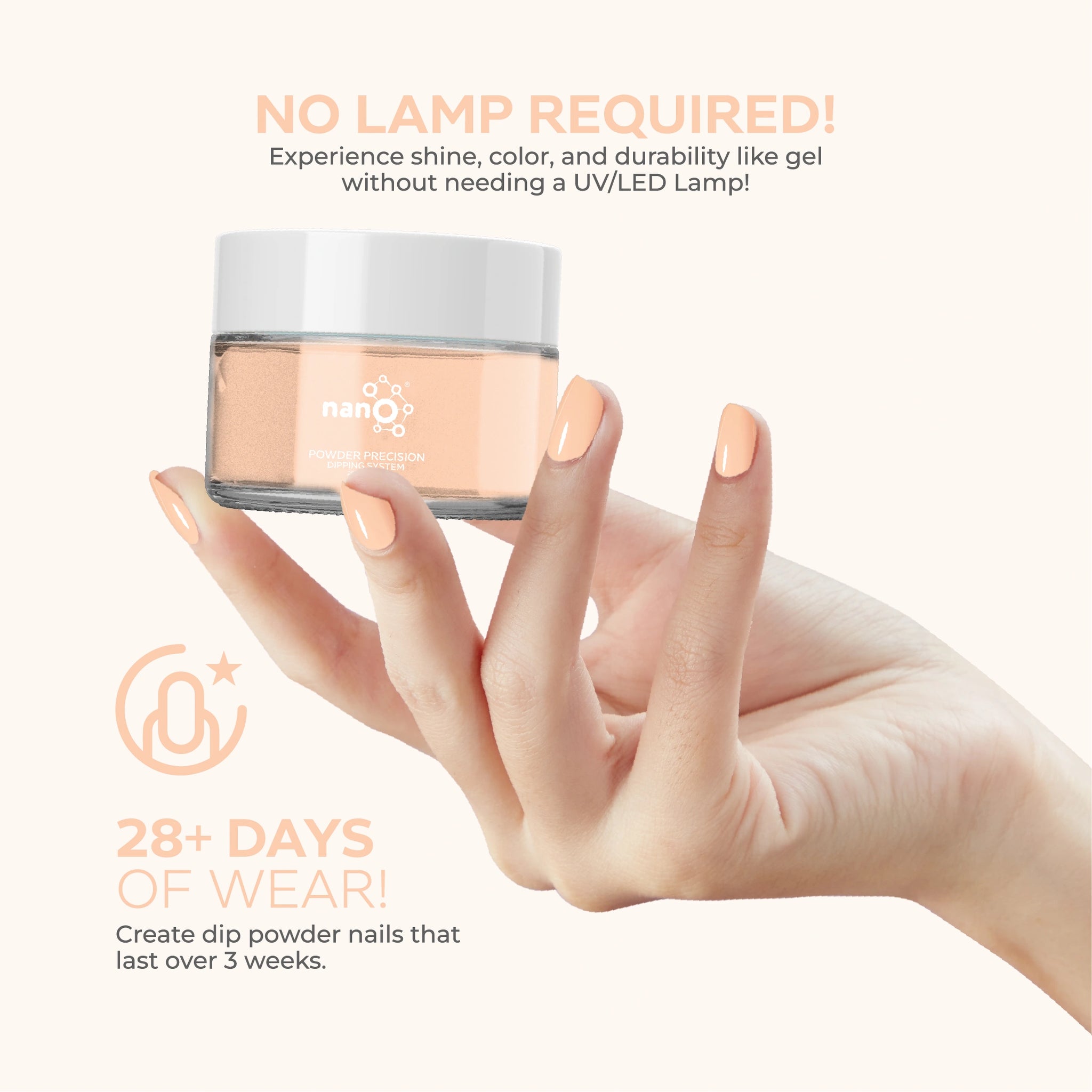 - Add the Powder: Immediately dip your nail into the Nano® Dip Powder or sprinkle the powder evenly over the nail. Gently tap off any excess powder.