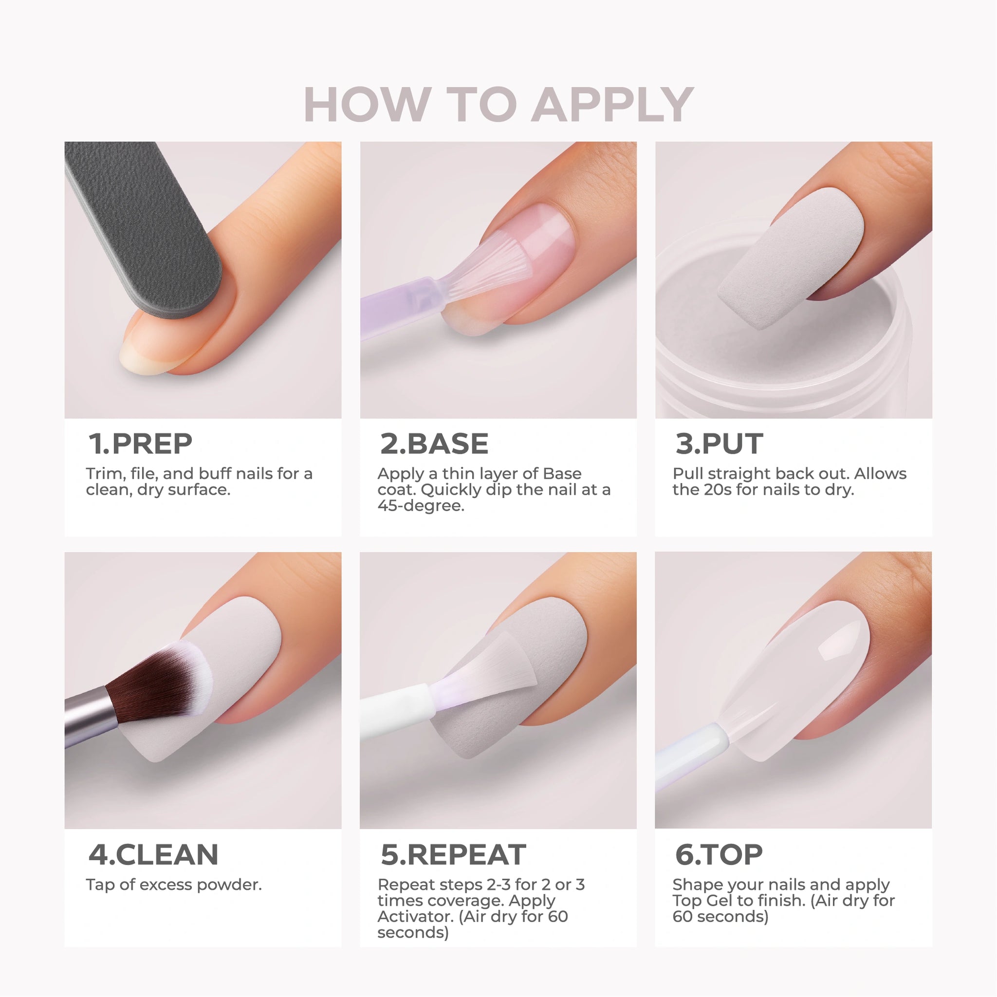 - Set with Activator: Once the dipping process is complete, apply Nano® Dip Powder Activator generously to each nail. This hardens the layers and locks them in place.