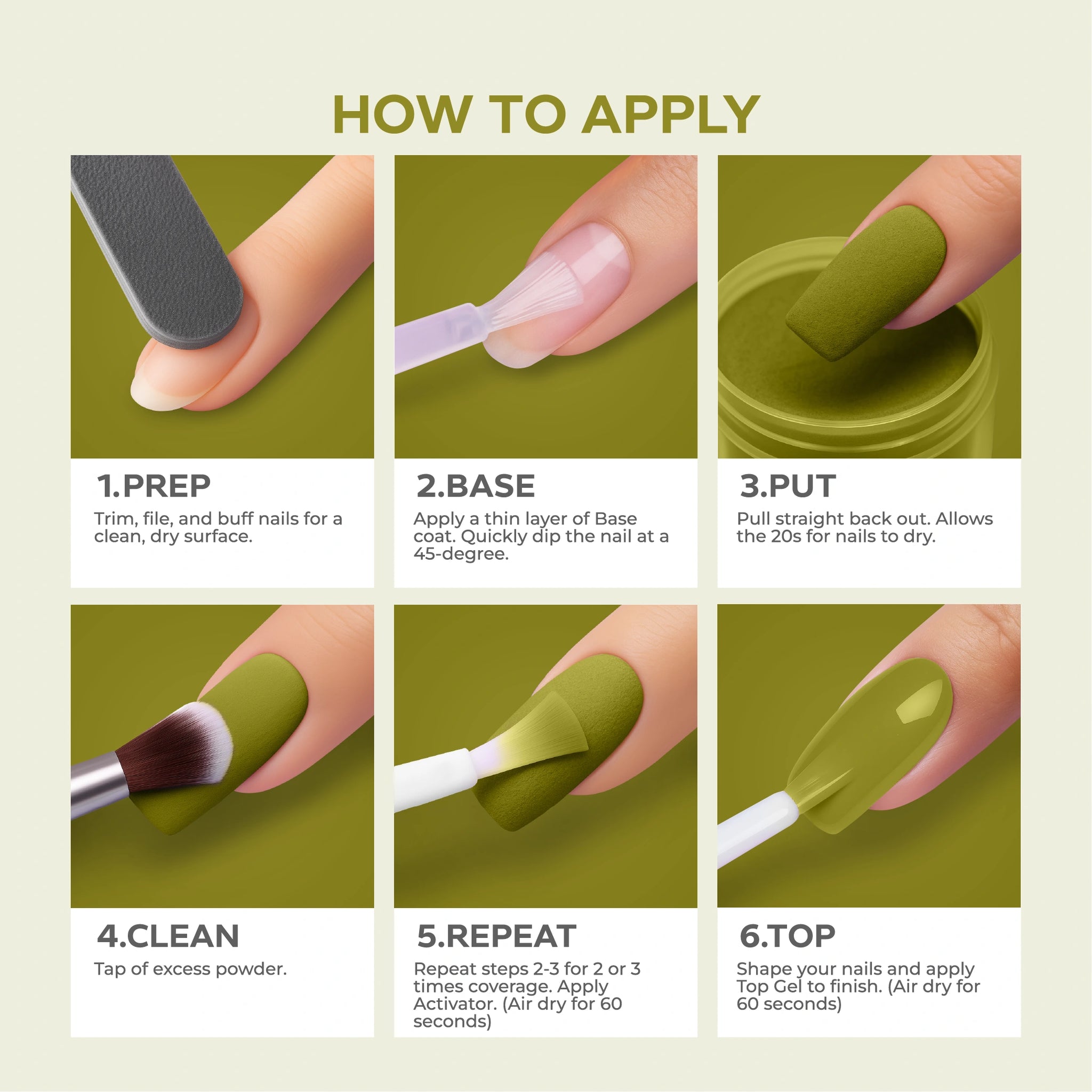 - Deep Olive Nail Dipping Powder delivers a rich, muted green tone with natural, earthy sophistication.