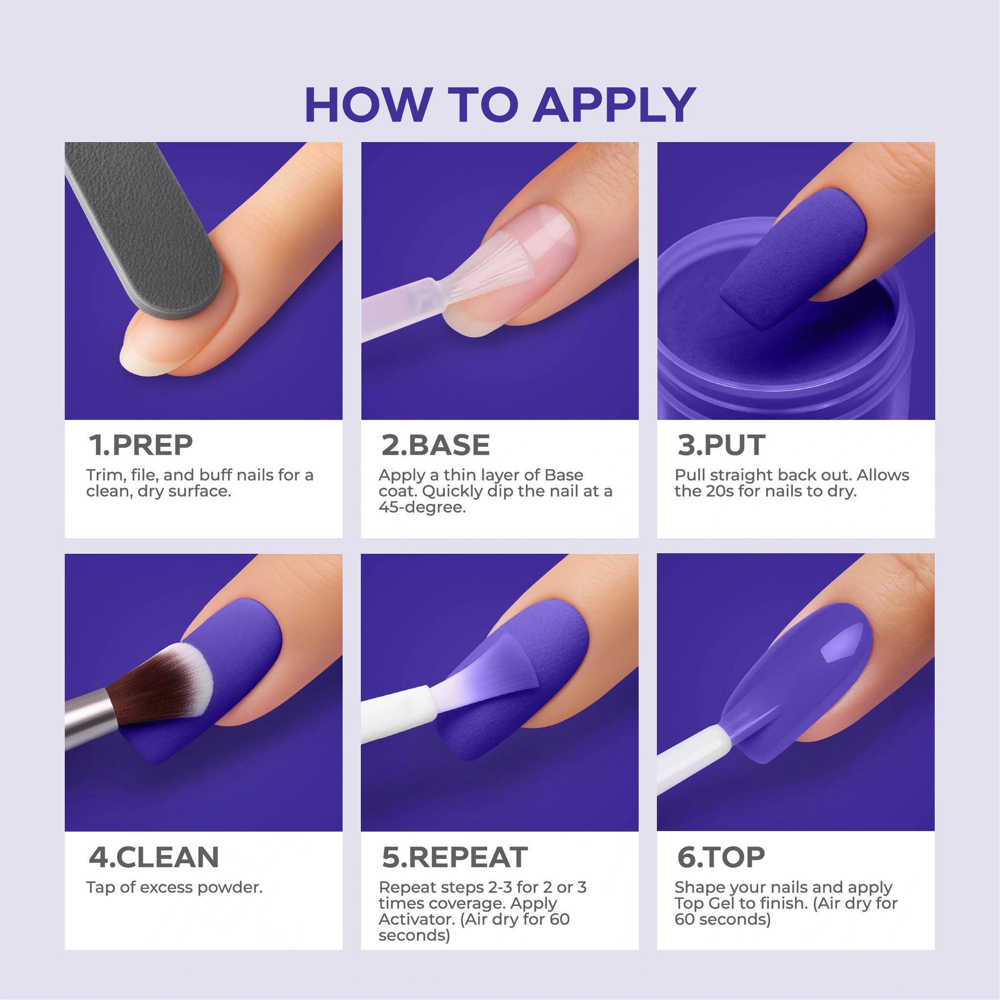 - Set with Activator: Once the dipping process is complete, apply Nano® Dip Powder Activator generously to each nail. This hardens the layers and locks them in place.
