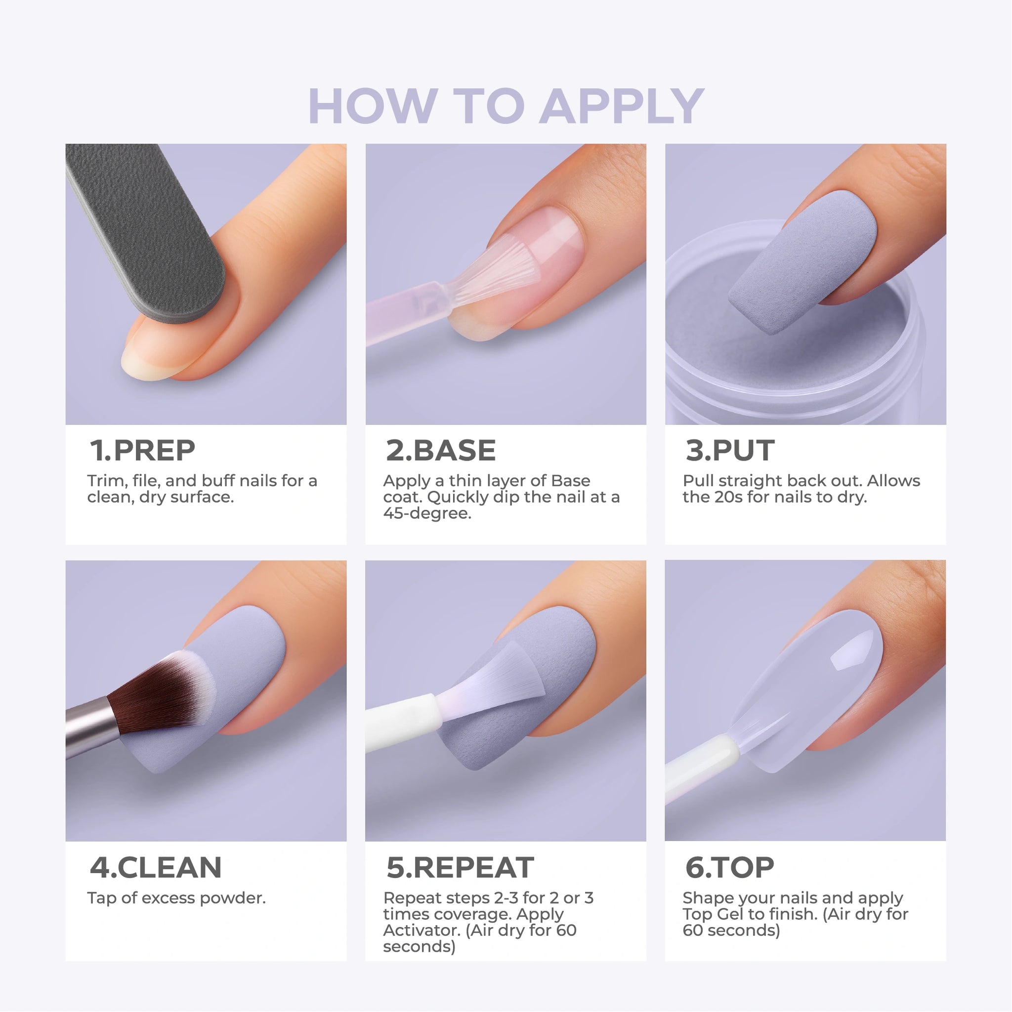 - Set with Activator: Once the dipping process is complete, apply Nano® Dip Powder Activator generously to each nail. This hardens the layers and locks them in place.