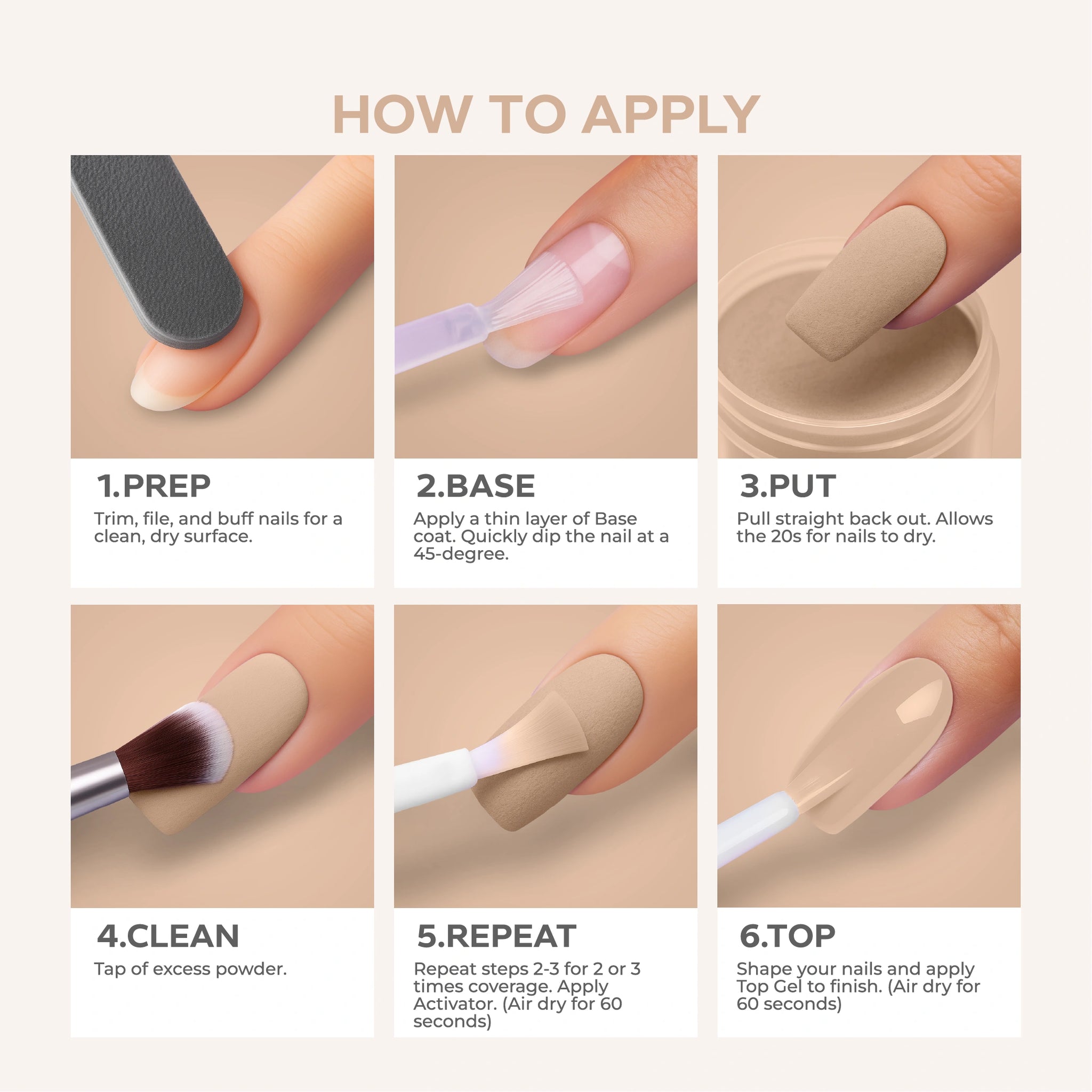 - Add the Powder: Immediately dip your nail into the Nano® Dip Powder or sprinkle the powder evenly over the nail. Gently tap off any excess powder.
