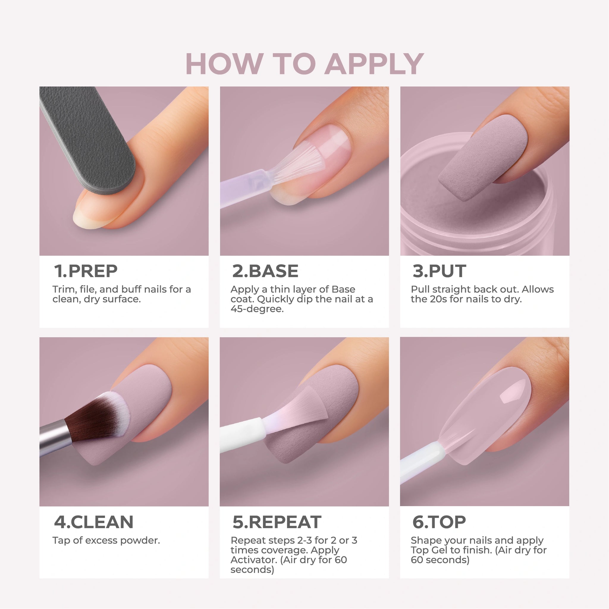 - Set with Activator: Once the dipping process is complete, apply Nano® Dip Powder Activator generously to each nail. This hardens the layers and locks them in place.