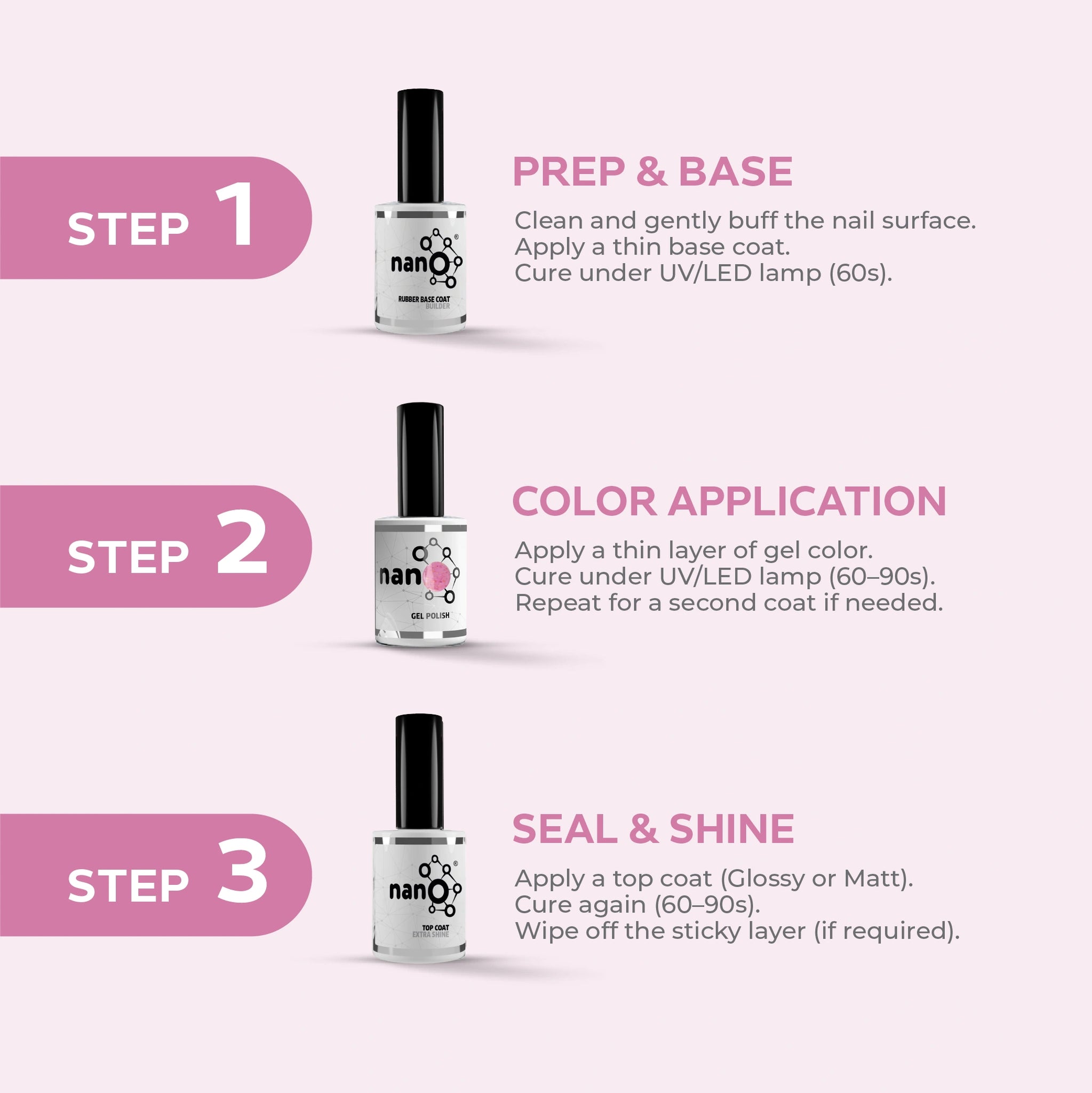 - Apply the first layer of Nano gel nail polish over the base coat and cure it for 60 seconds under a UV/LED lamp.