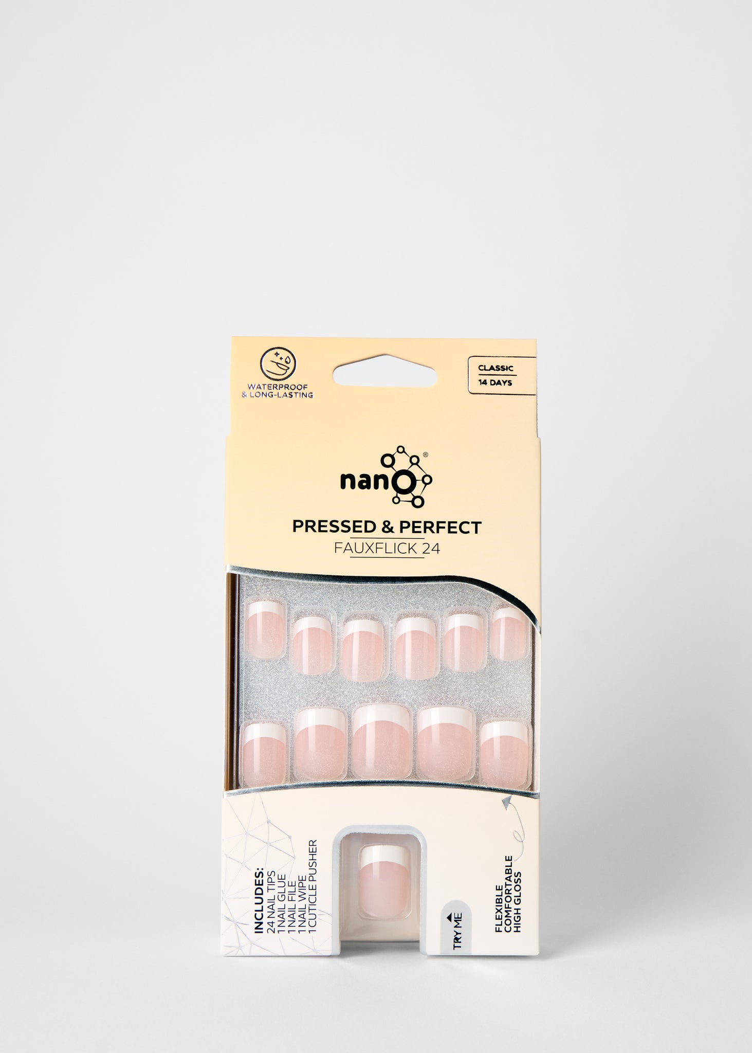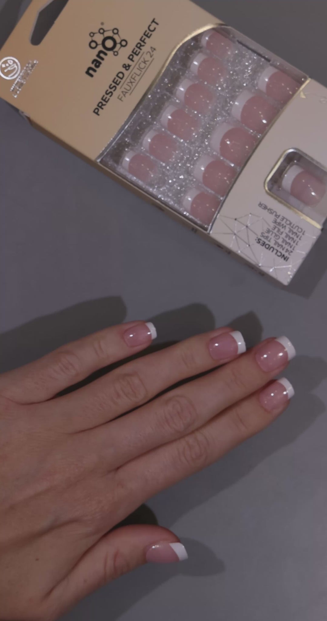 Nano® Parisian Whisper Pressed on Nails - 24pcs with Glue | Instant Gel-Like Shine, Soft Pink French Tip Fake Nails Set