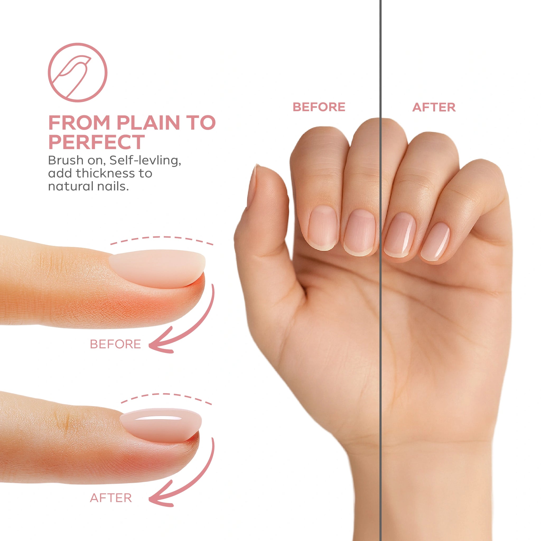 Vegan and gentle on nails, this professional rubber base gel offers salon-quality results with a soft peach perfection look.