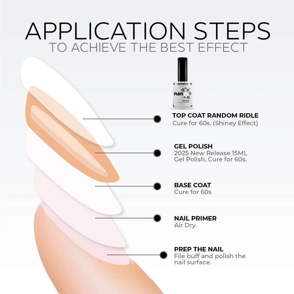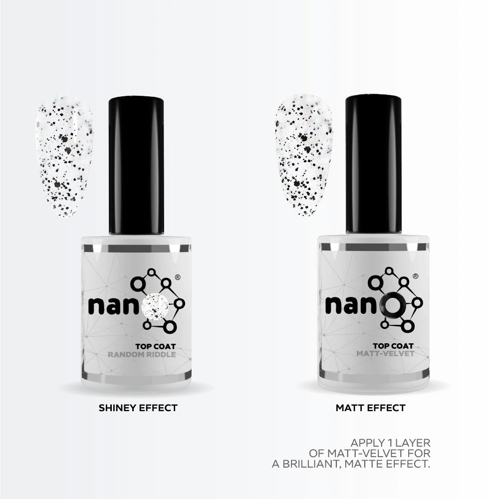 - Finish the procedure with the Nano® Extra Shine top coat to seal in the polish. and cure the same for 60 seconds.