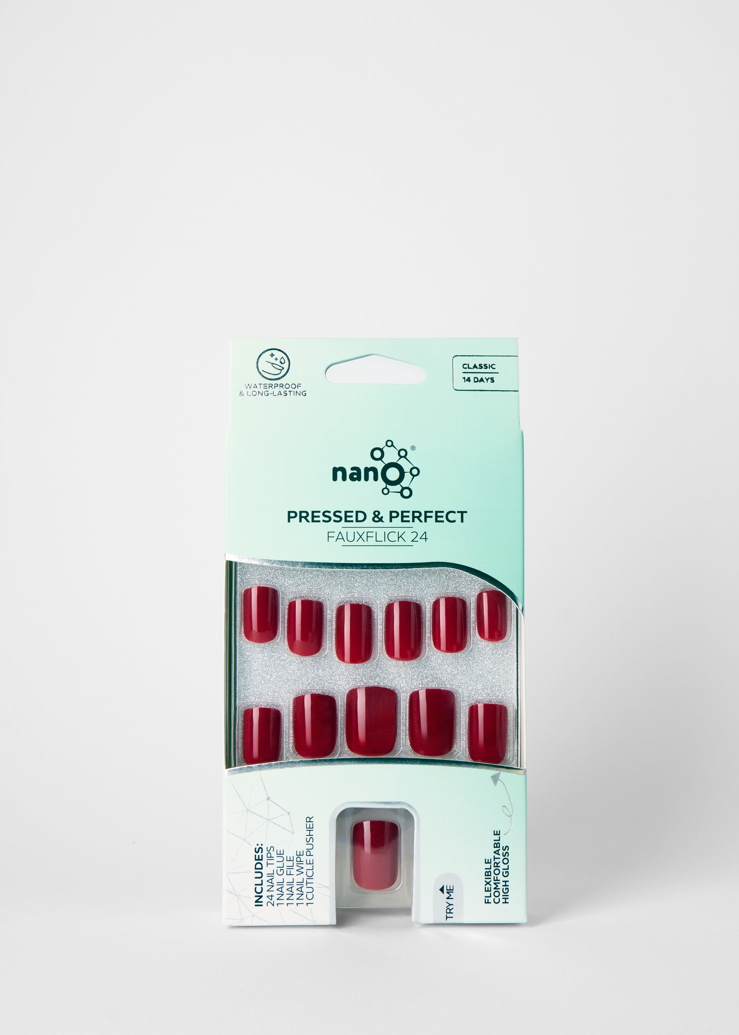 Nano® Ruby Desire Pressed on Nails - 24pcs with Glue | Instant Gel-Like Shine, Deep Red Glossy Fake Nails Set