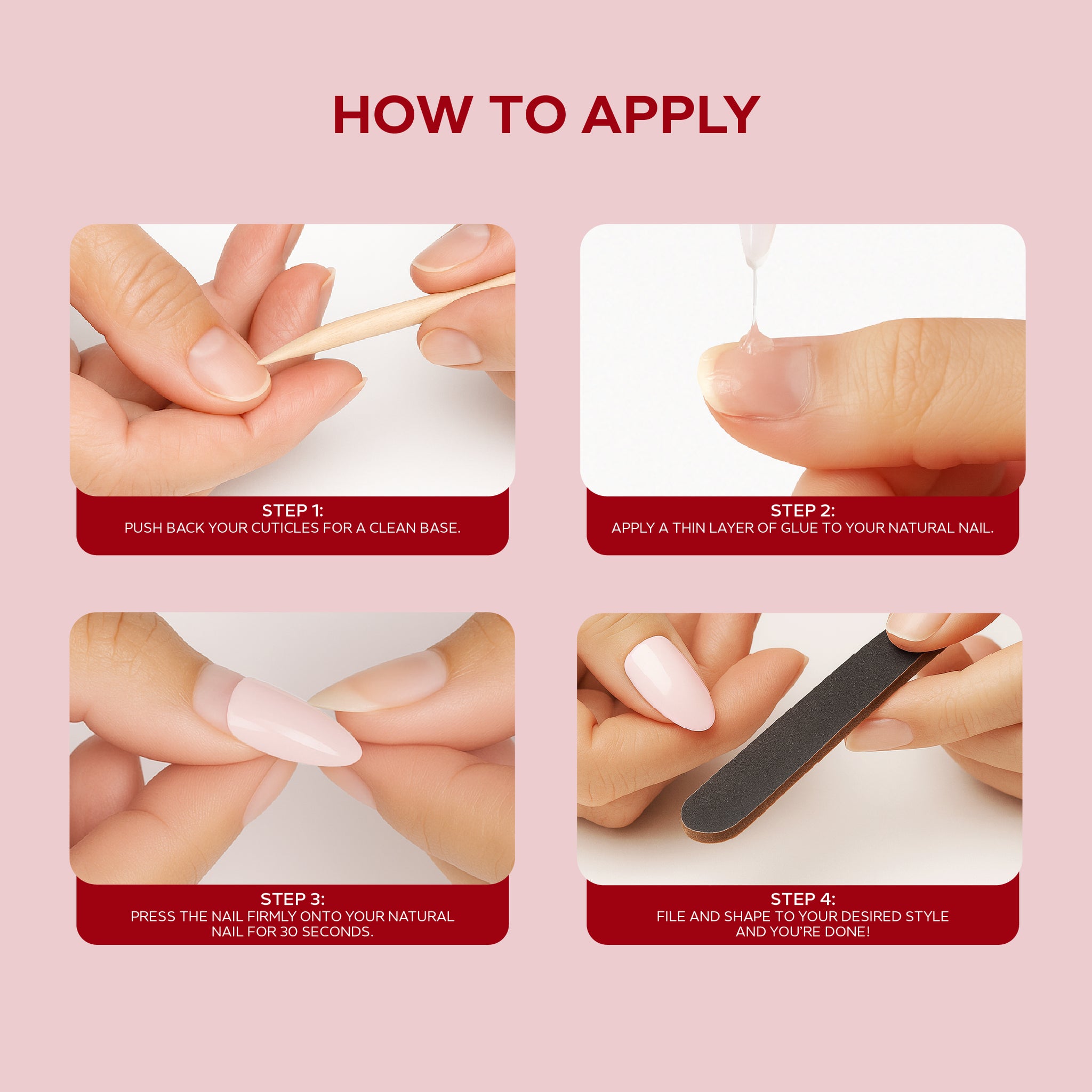 - Complete Manicure Kit: Includes 24 nails, nail glue, prep wipe, and cuticle pusher — everything for a salon-style setup at home.