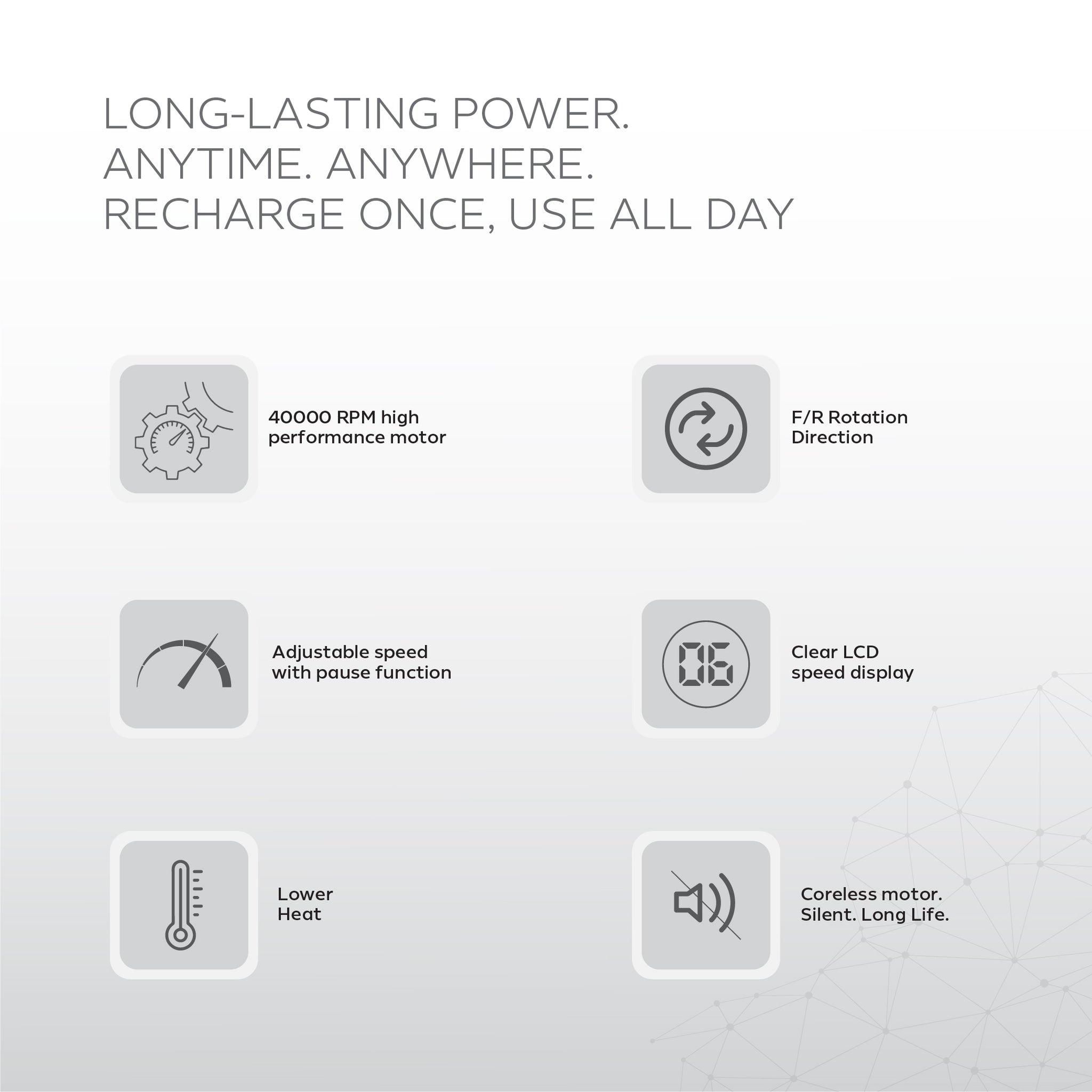 Powered by a brushless motor, it operates quietly up to 40,000 RPM for smooth filing, shaping, and gel or acrylic removal.